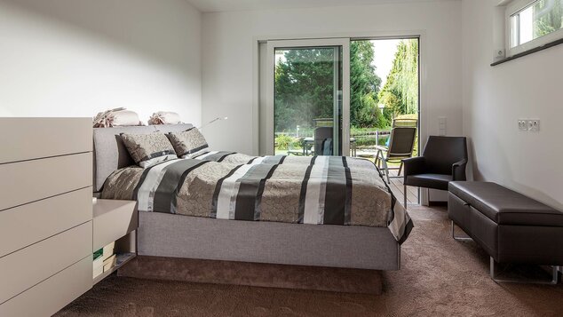 Über insgesamt 119 m² Wohnfläche verteilt sich bei Haus Valentin ein Traum vom Wohnen, der Singles und Paaren viel Komfort auf einer Ebene bietet. Die weiße Fassade versprüht in Kombination mit den anthrazitfarbenen Türen und Fenstern moderne Eleganz. Unterstützt wird diese durch das herausgezogene Vordach auf Säulen über dem Haupteingang sowie durch den Anbau im hinteren Teil des Hauses. Beides ist perfekt in die Walmdachkonstruktion eingefügt. Auf der Hausrückseite wurden große Panoramafenster mit Schiebetüren eingeplant. So gelangt viel Licht ins Haus hinein und ein freier Blick hinaus in den Garten. Im Gästezimmer mit gegenüberliegendem Duschbad fühlt sich jeder Besuch wohl. Das Hauptschlafzimmer verfügt über einen eigenen Zugang auf die Terrasse sowie über ein Wellness-Bad mit Sauna. Der Wohn-/Essbereich wird vervollständigt durch eine offene Küche mit moderner Kochinsel. Der Esstisch befindet sich im herausgezogenen, fast vollverglasten Anbau. So speisen Bewohner und ihre Gäste gefühlt stets draußen, selbst wenn sie im Inneren sitzen. Darüber hinaus ergänzt ein praktischer Hauswirtschaftsraum das Raumangebot.
